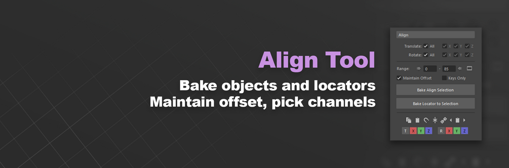 - Bake Locator to Selection - This will create a locator and align it to your selections over the given time range. Either every frame, or on the target's keytimes if Keys Only is enabled.